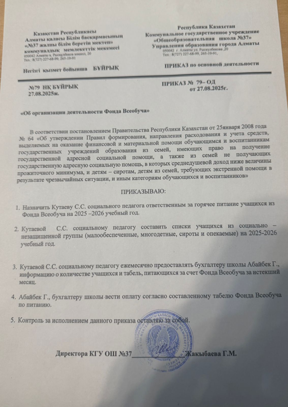 Жалпыға бірдей білім беру қорының қызметін ұйымдастыру туралы бұйрық. Приказ об организации деятельности Фонда Всеобуча