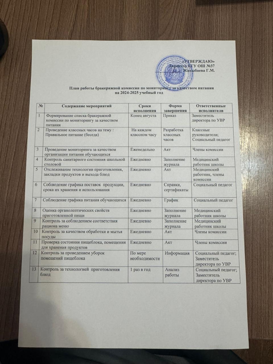 План работы бракеражной комиссии по мониторингу за качеством питания