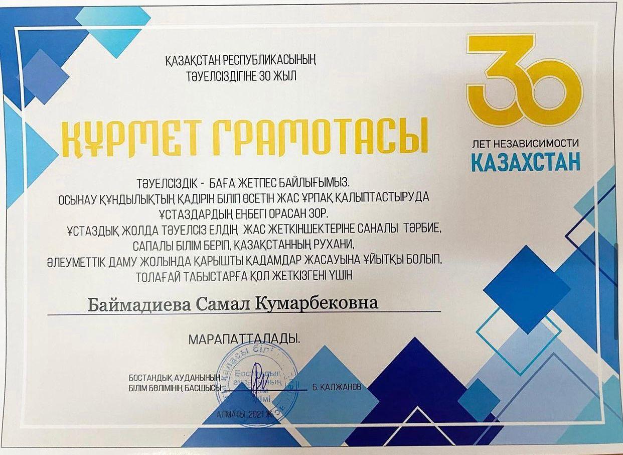Наши учителя Бегалиева С.Т., Баймадиева С.К., Исаханова Ж.К. были награждены почетной грамотой ко Дню Независимости РК от руководителя Бостандыкского РОО Калжанова Б.Б.